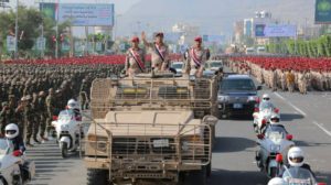 وتقدّم قائد الاستعراض العميد محمد شرف الروحاني إلى أمام المنصة لطلب الإذن من فخامة الرئيس المشاط لبدء العرض العسكري المهيب الذي استمر ثلاث ساعات.