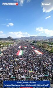 شهدت العاصمة صنعاء اليوم، طوفانا بشريا في مليونية “شكرا لله واحتفاءً بالنصر.. ساحاتنا واحدة في مواجهة الصهيونية” مباركة للشعب الإيراني وقيادته ومجاهدي المحور والأمة الإسلامية بالانتصار العظيم، وتأكيدا على ثبات الموقف في نصرة المقاومة في لبنان وفلسطين.